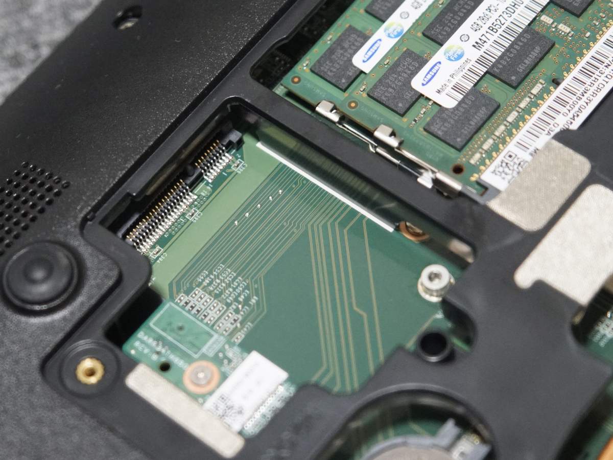 基本的にビジネスモデルPCというのは「上位モデルも下位モデルもだいたいマザボ共通」なのでいじり甲斐があるわけです。メモリ増設がてら底面スロット確認してみたら mSATA専用のスロットもあるので、SSD+HDD化もできるじゃん!